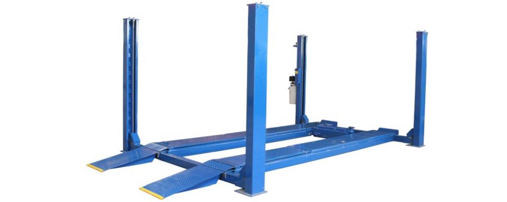 Конструкция состоит из четырёх вертикальных стоек и двух (иногда четырёх) платформ-направляющих, по которым автомобиль заезжает как на мини-эстакаду. Подъём реализуется через гидравлику или электромеханику, а синхронизация чаще всего выполняется тросовой системой. За счёт распределения нагрузки на четыре опоры подъёмник даёт высокую устойчивость и подходит для длительного удержания автомобиля на высоте.