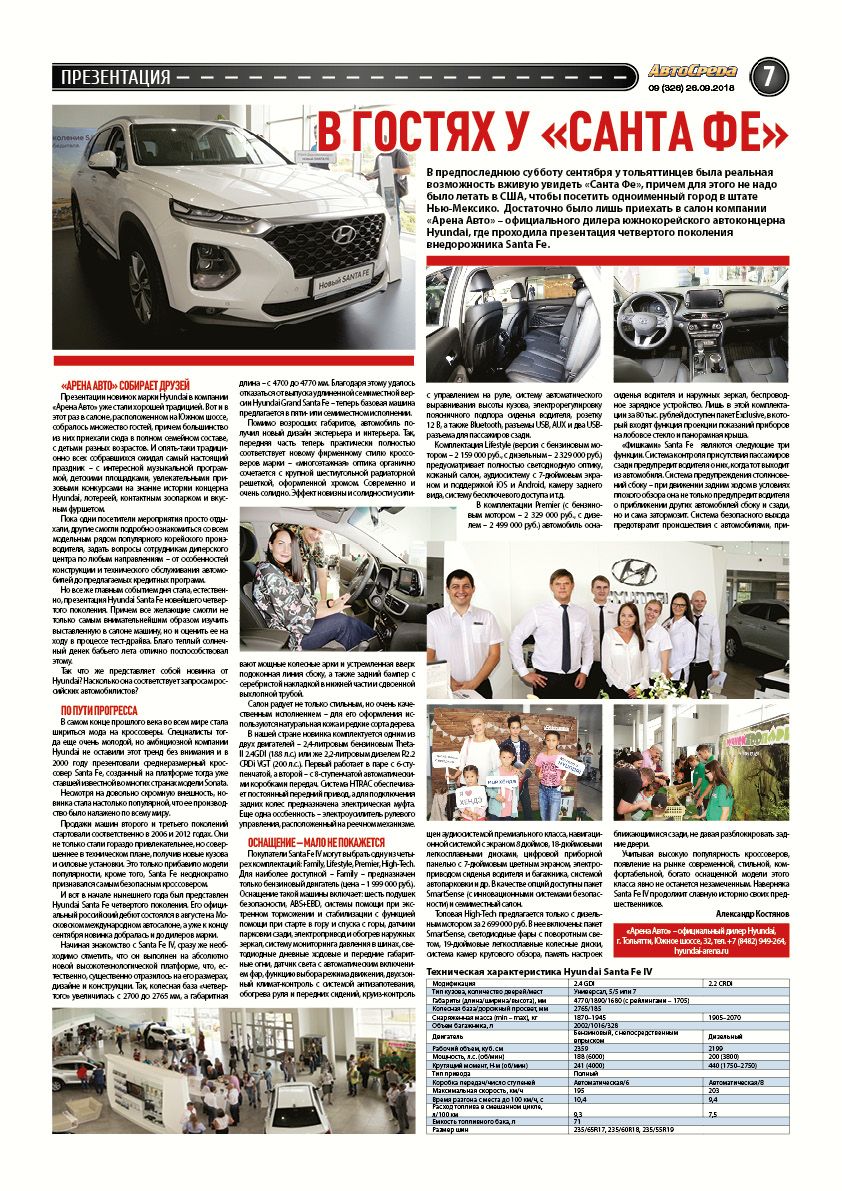 В предпоследнюю субботу сентября у тольяттинцев была реальная возможность вживую увидеть Санта Фе, причем для этого не надо было летать в США, чтобы посетить одноименный город в штате Нью-Мексико. Достаточно было лишь приехать в салон компании «Арена Авто» – официального дилера южнокорейского автоконцерна Hyundai, где проходила презентация четвертого поколения внедорожника Santa Fe.