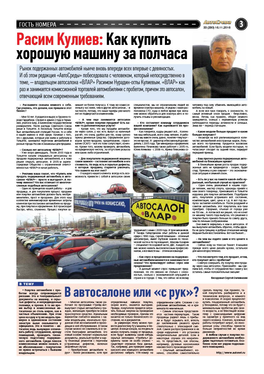 Рынок подержанных автомобилей нынче вновь впереди всех впервые с девяностых. И об этом редакция «АвтоСреды» побеседовала с человеком, который непосредственно в теме – владельцем автосалона «ВЛАР» Расимом Нурадин-оглы Кулиевым. «ВЛАР» как раз и занимается комиссионной торговлей автомобилей с пробегом, причем это автосалон, отвечающий всем современным требованиям.